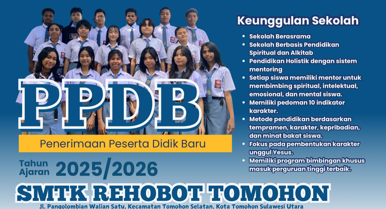 TOMOHON|PRONEWS- SMTK Rehobot Tomohon, yang terletak di Jl. Pangolombian Walian Satu, Kecamatan Tomohon Selatan, Kota Tomohon, Sulawesi Utara, kini membuka Penerimaan Peserta Didik Baru (PPDB) untuk tahun ajaran 2025/2026.